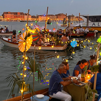 Tradicionalmente, durante o pôr do sol, as embarcações decoradas com luzes, balões coloridos e fitas começam a se reunir e a se posicionar ao longo da Baia de São Marcos e no Canal da Giudecca.